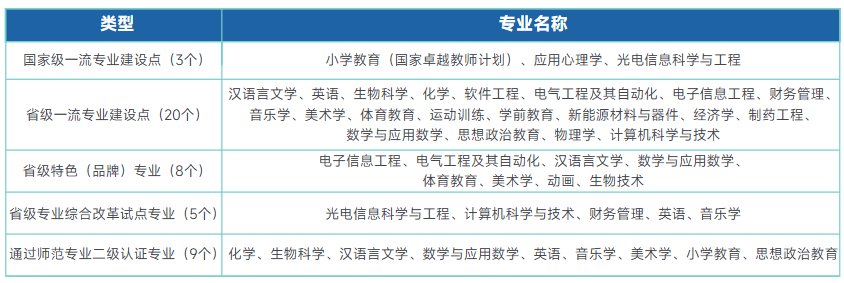 学校共有3个国度级一流专业扶植点、20个省级一流专业扶植点、8个省级特色(品牌)专业、5个省级专业分析试点专业、9个专业通过师范专业二级认证。